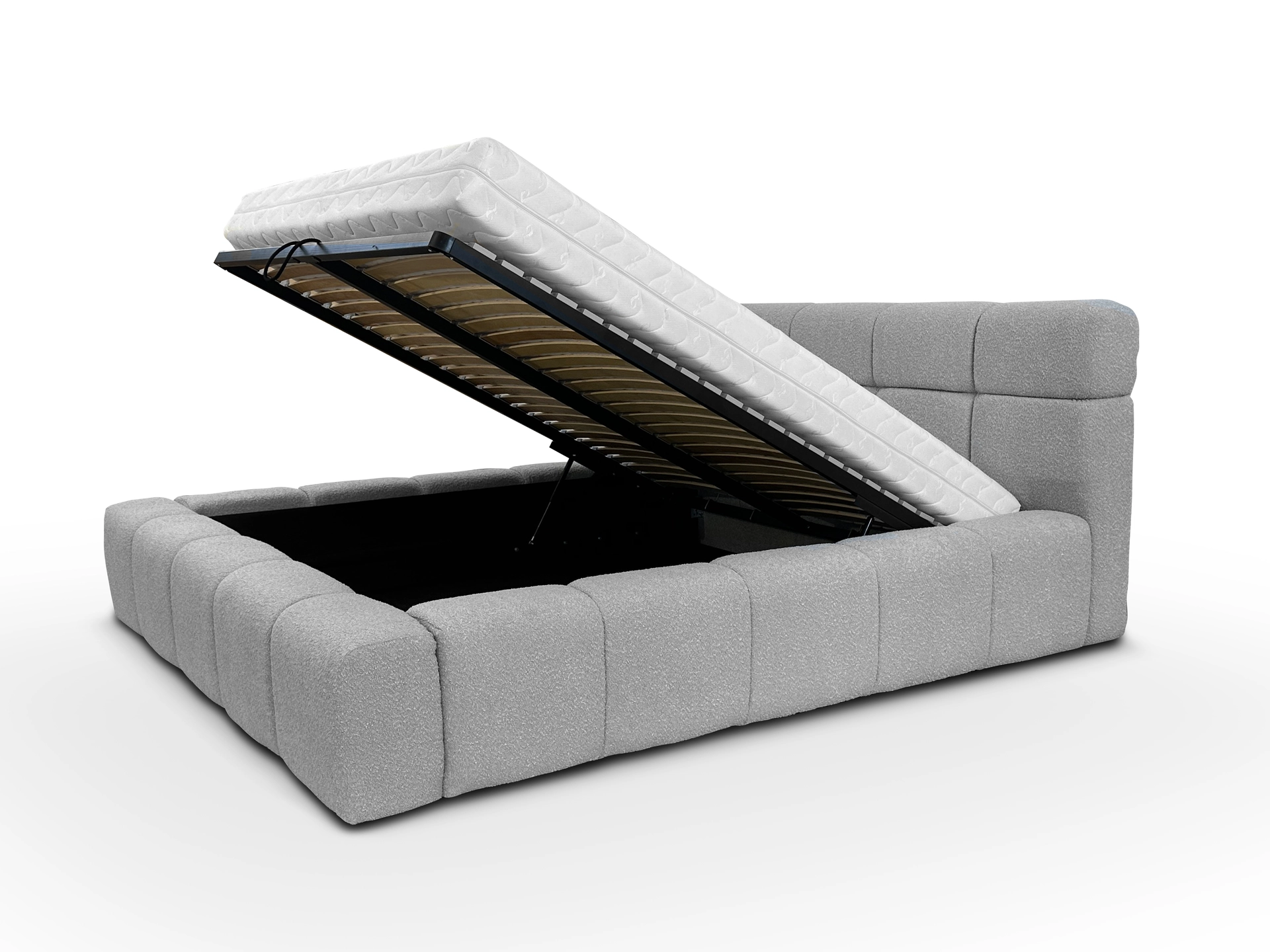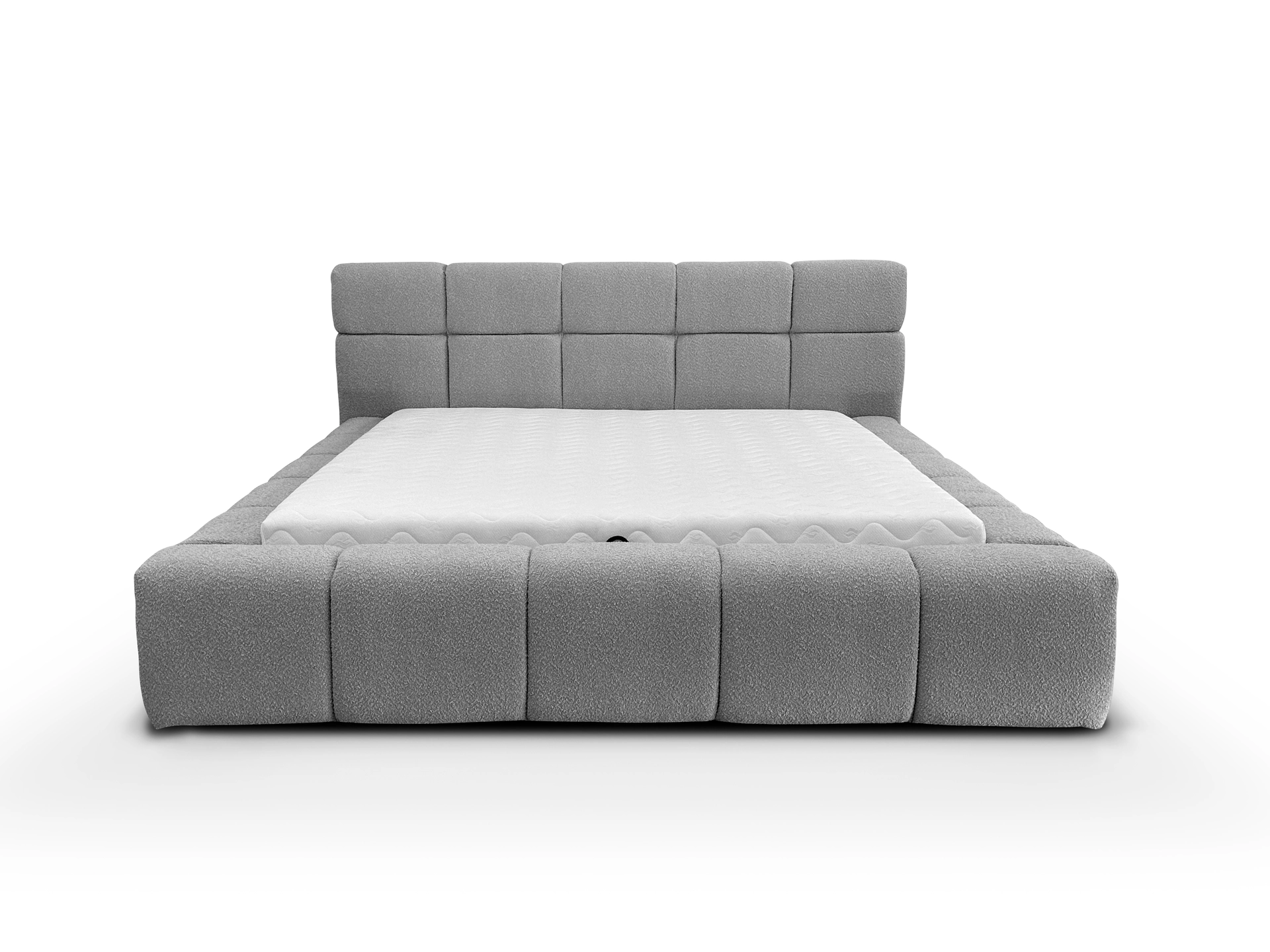 • Constructie: Metalen bedframe met gascilinders zorgt voor stabiliteit en langdurige ondersteuning. Flexibele latten onder de matras zorgen voor voldoende ventilatie en slaapcomfort. Kies tussen een bedframe met 34 of 48 latten. Het bed heeft een beddingbox, afgewerkt in zwart wigofile, die extra opbergruimte biedt. De vloer van de beddingkast bestaat uit vier stukken spaanplaat van 12 mm, bekleed met zwart vigofile. De bedstructuur inclusief de vloer rust op 15 mm hoge driehoekige glijders, die voor luchtcirculatie onder het bed zorgen. Het frame is gemaakt van 16 mm dik spaanplaat, versterkt met houten elementen. Alles bekleed met 5 cm+1 cm havermout dik T25 schuim, waardoor het bed zacht aanvoelt en de structurele elementen niet voelbaar zijn. Slaapkamerbed verkrijgbaar in de maten 120×200 cm, 140×200 cm, 160×200 cm, 180×200 cm, 200×200 cm.