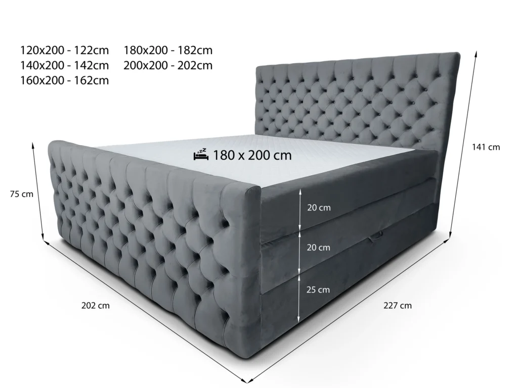 • Constructie: De bedstructuur is gebaseerd op 15 mm hoge driehoekige glijders, die zorgen voor luchtcirculatie onder het bed. Het frame is gemaakt van 16 mm dik spaanplaat, versterkt met houten elementen. Hoofdbord bekleed met 5 cm dik T25 schuim + 1 cm haver. Beddengoedboxen gemaakt van 16 mm spaanplaat, in wit laminaat. Het bed is voorzien van automatische gasflessen om te helpen bij het openen van de beddingboxen. Het bed bestaat uit een ingebouwde bonell matras, die aan de bovenkant is dichtgenaaid met Anty Slip stof om te voorkomen dat de topmatras verschuift. De topmatras met hardheid H3, H4 of H5 is bekleed met bedkleurige stof, het ligvlak is afgewerkt met een doorgestikte matrasstof, de onderkant is afgewerkt met Anty Slip stof. Bed verkrijgbaar in de maten 120×200 cm, 140×200 cm, 160×200 cm, 180×200 cm, 200×200 cm.