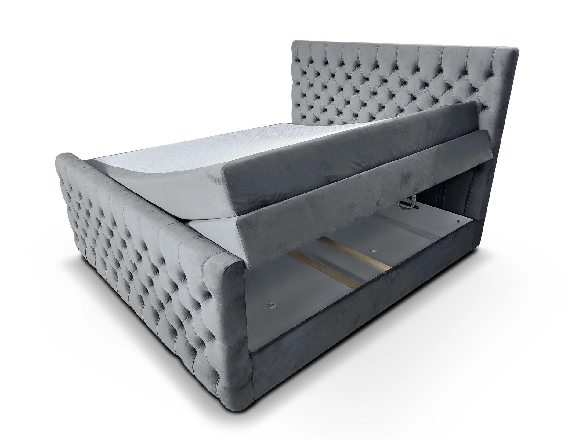 • Constructie: De bedstructuur is gebaseerd op 15 mm hoge driehoekige glijders, die zorgen voor luchtcirculatie onder het bed. Het frame is gemaakt van 16 mm dik spaanplaat, versterkt met houten elementen. Hoofdbord bekleed met 5 cm dik T25 schuim + 1 cm haver. Beddengoedboxen gemaakt van 16 mm spaanplaat, in wit laminaat. Het bed is voorzien van automatische gasflessen om te helpen bij het openen van de beddingboxen. Het bed bestaat uit een ingebouwde bonell matras, die aan de bovenkant is dichtgenaaid met Anty Slip stof om te voorkomen dat de topmatras verschuift. De topmatras met hardheid H3, H4 of H5 is bekleed met bedkleurige stof, het ligvlak is afgewerkt met een doorgestikte matrasstof, de onderkant is afgewerkt met Anty Slip stof. Bed verkrijgbaar in de maten 120×200 cm, 140×200 cm, 160×200 cm, 180×200 cm, 200×200 cm.