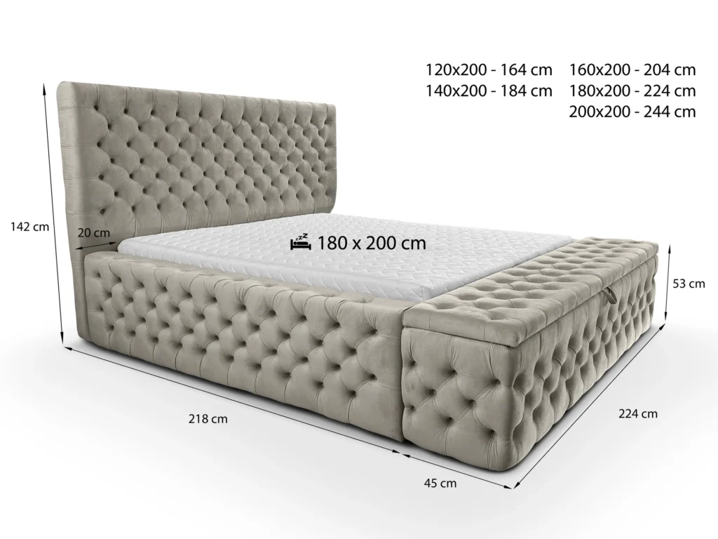 • Constructie: Het metalen bedframe met gasflessen biedt stabiliteit en langdurige ondersteuning. Flexibele latten onder de matras zorgen voor voldoende ventilatie en slaapcomfort. Kies tussen een bedframe met 34 of 48 latten. Het bed heeft een beddingbox, afgewerkt in zwart wigofile, die extra opbergruimte biedt. De vloer van de beddingkast bestaat uit vier stukken spaanplaat van 12 mm, bekleed met zwart vigofile. De bedstructuur inclusief de vloer rust op 15 mm hoge driehoekige glijders, die zorgen voor luchtcirculatie onder het bed. Het frame is gemaakt van 16 mm dikke spaanplaat, versterkt met houten elementen. Het geheel is bekleed met 5 cm+1 cm havermout T25 schuim, waardoor het bed zacht aanvoelt en de structurele elementen niet voelbaar zijn. De box aan de voorkant van het bed wordt geopend met automatische veren. De binnenkant is afgewerkt met een zwarte vigofile. Gestoffeerd bed verkrijgbaar in de maten 120×200 cm, 140×200 cm, 160×200 cm, 180×200 cm, 200×200 cm.