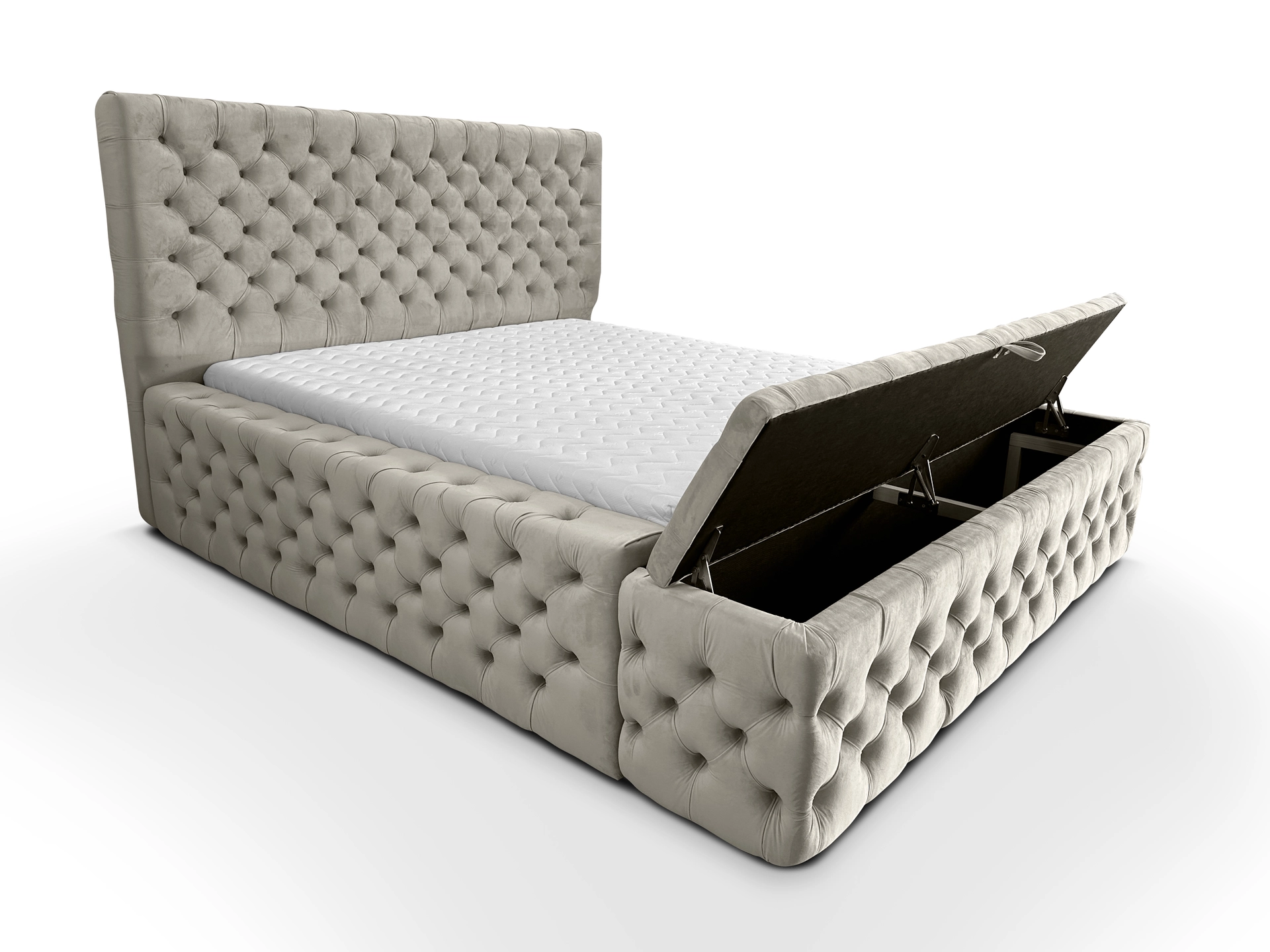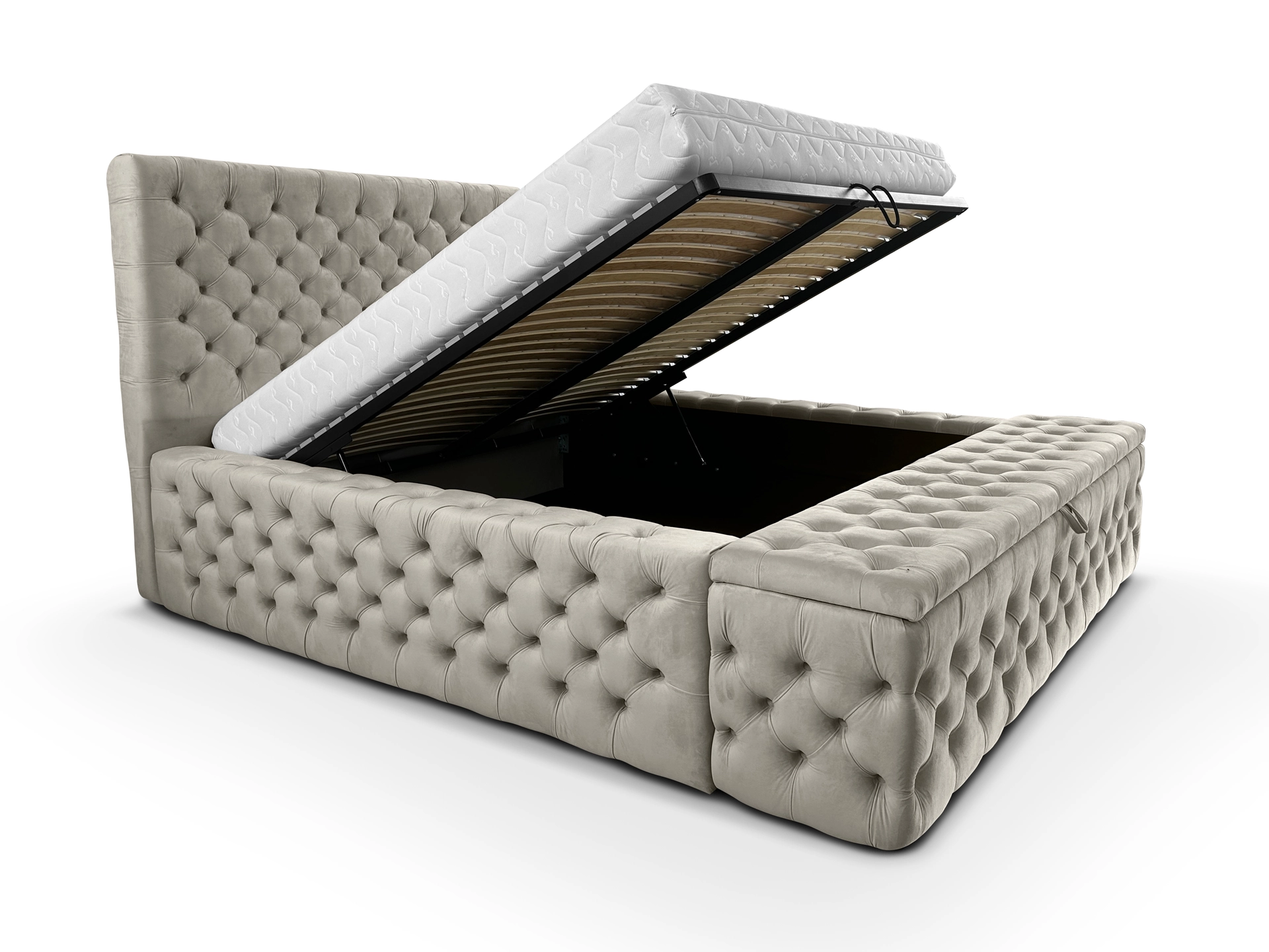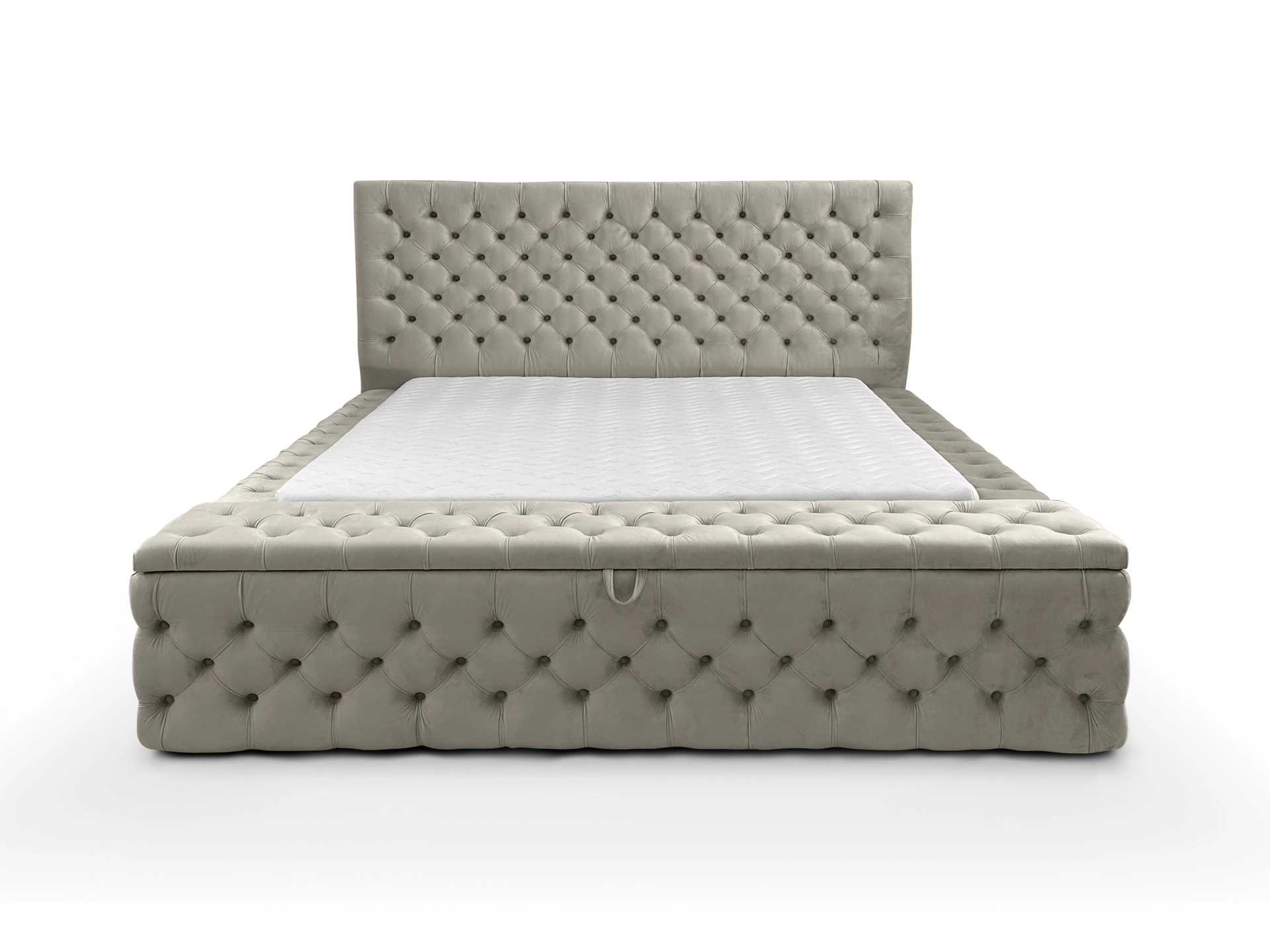 • Constructie: Het metalen bedframe met gasflessen biedt stabiliteit en langdurige ondersteuning. Flexibele latten onder de matras zorgen voor voldoende ventilatie en slaapcomfort. Kies tussen een bedframe met 34 of 48 latten. Het bed heeft een beddingbox, afgewerkt in zwart wigofile, die extra opbergruimte biedt. De vloer van de beddingkast bestaat uit vier stukken spaanplaat van 12 mm, bekleed met zwart vigofile. De bedstructuur inclusief de vloer rust op 15 mm hoge driehoekige glijders, die zorgen voor luchtcirculatie onder het bed. Het frame is gemaakt van 16 mm dikke spaanplaat, versterkt met houten elementen. Het geheel is bekleed met 5 cm+1 cm havermout T25 schuim, waardoor het bed zacht aanvoelt en de structurele elementen niet voelbaar zijn. De box aan de voorkant van het bed wordt geopend met automatische veren. De binnenkant is afgewerkt met een zwarte vigofile. Gestoffeerd bed verkrijgbaar in de maten 120×200 cm, 140×200 cm, 160×200 cm, 180×200 cm, 200×200 cm.