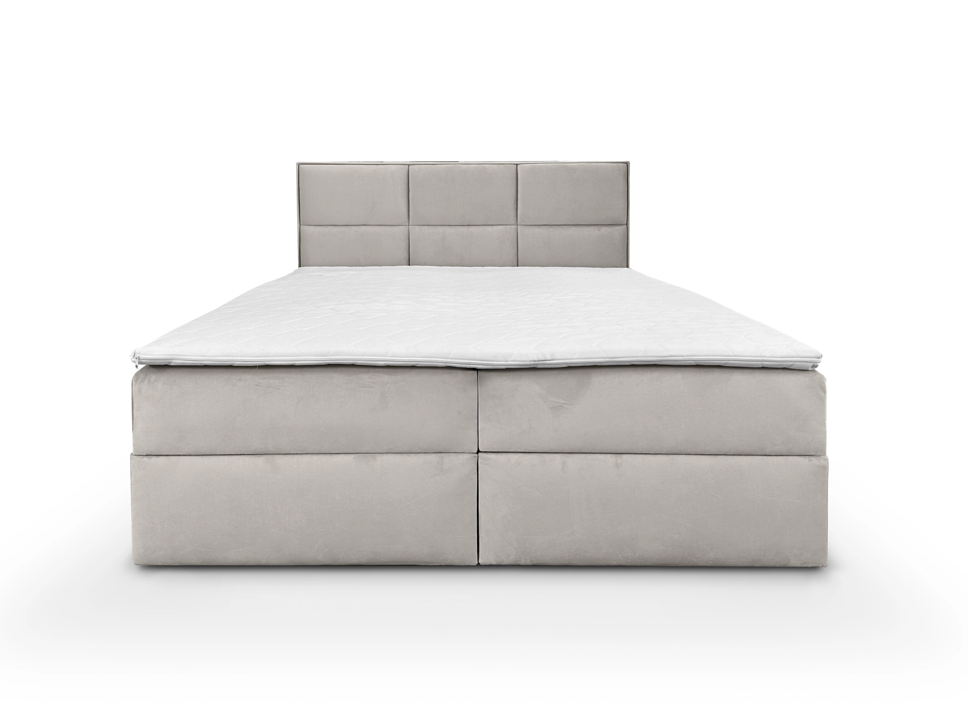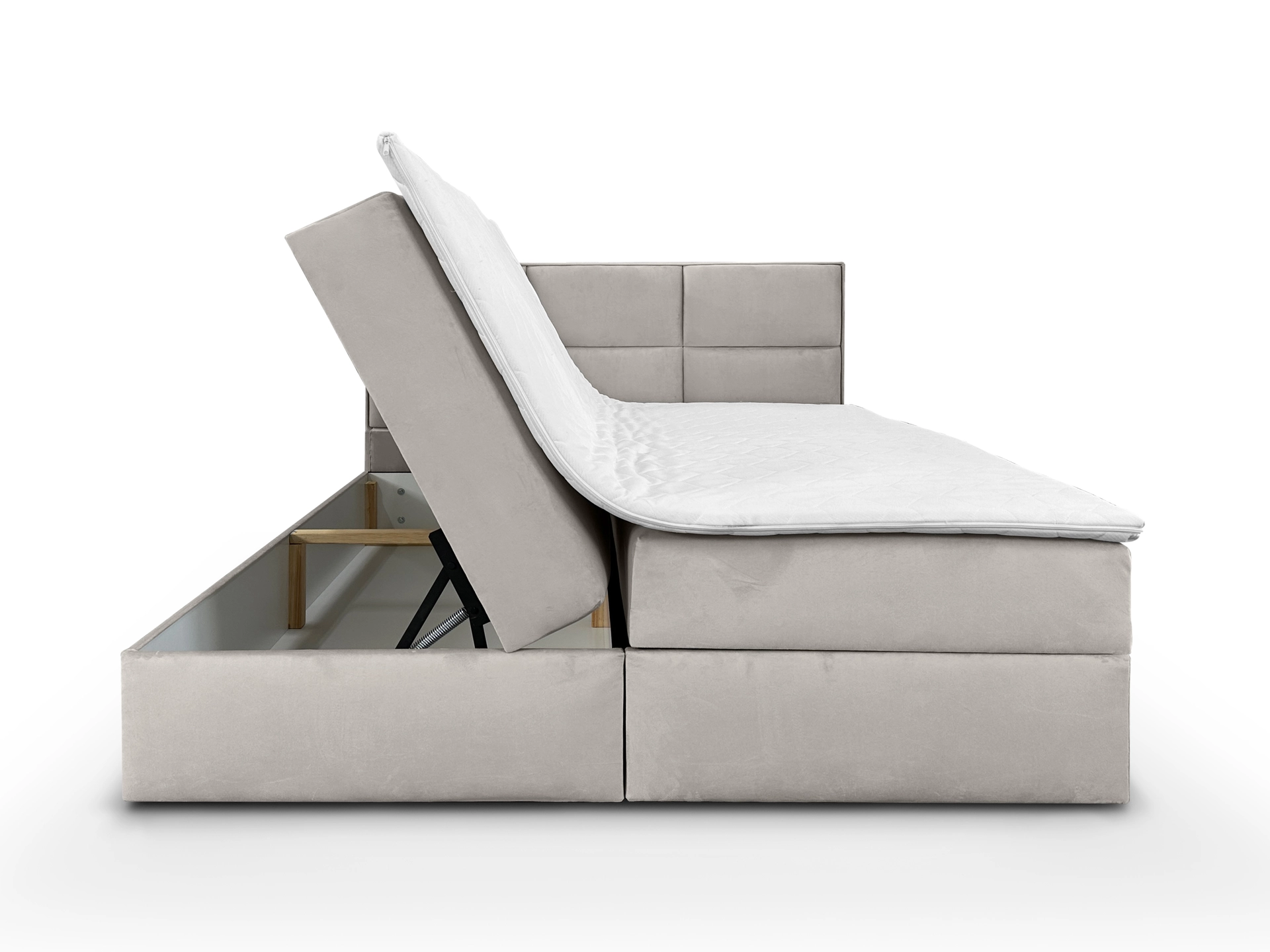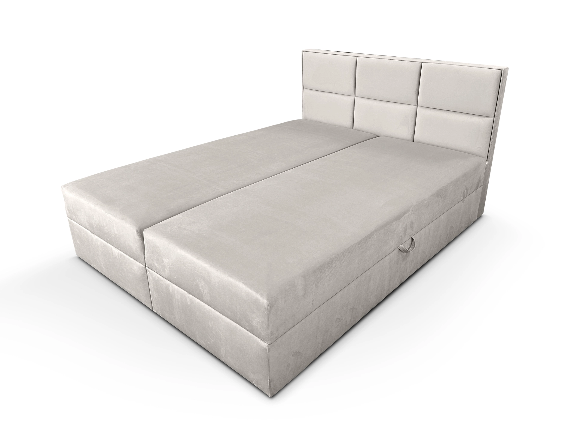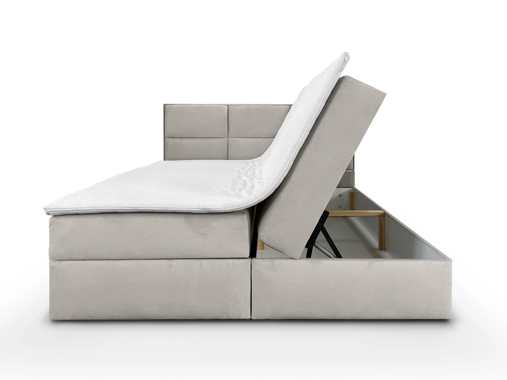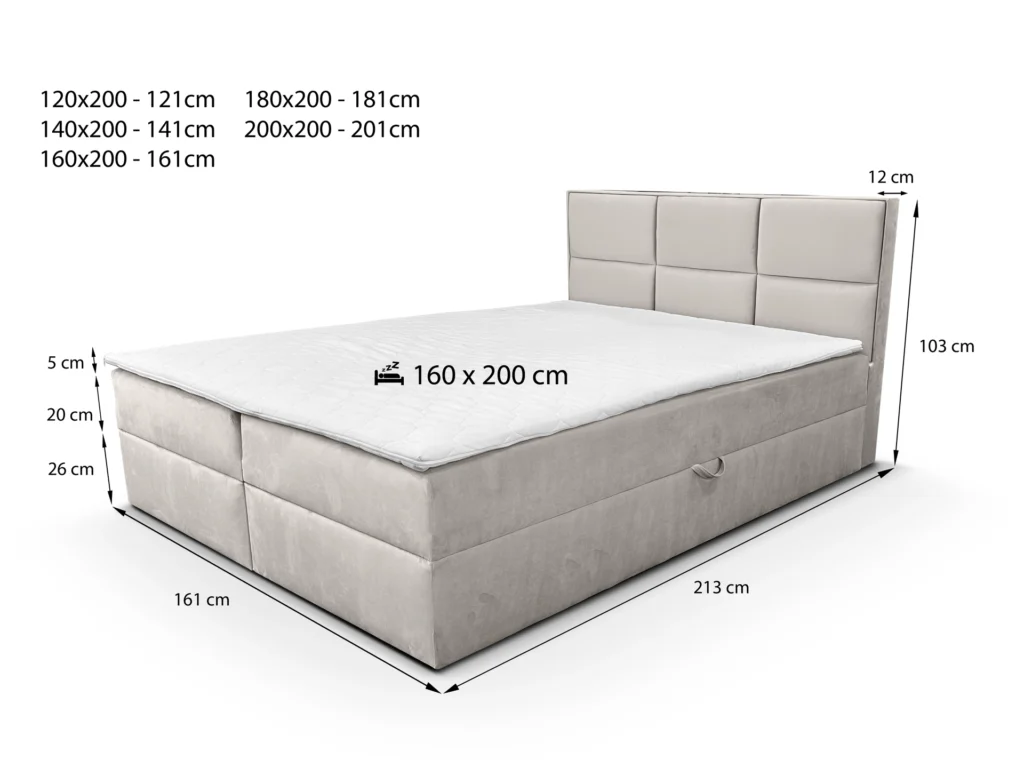 • Constructie: De bedstructuur is gebaseerd op 15 mm hoge driehoekige glijders, die zorgen voor luchtcirculatie onder het bed. Het frame is gemaakt van 16 mm dik spaanplaat, versterkt met houten elementen. Alles bedekt met T25 schuim. Beddengoedboxen gemaakt van 16 mm spaanplaat, in wit laminaat. Het bed is uitgerust met automatische gasflessen om te helpen bij het openen van de beddingboxen. Het bed bestaat uit een ingebouwde bonell- of pocketmatras (naar keuze), die aan de bovenkant is dichtgenaaid met Anty Slip stof om te voorkomen dat de topper verschuift. Het gestoffeerde bed is verkrijgbaar in de maten 120×200 cm, 140×200 cm, 160×200 cm, 180×200 cm, 200×200 cm.